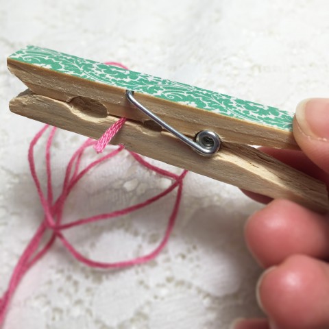 I was recently on a mission to tidy up my Love Catcher sewing box. It contains all the bits and pieces I need to prepare the embroidery hoops for the Love Catchers. I began pulling everything out of the box and sorting things into piles, which is when I quickly discovered a mishmash of embroidery thread pieces. They’re good lengths of embroidery thread (perfectly suitable to keep around), so I whipped out some clothespins and got to work on organizing them. When I posted a picture on Instagram of the nicely organized threads, folks were tickled {and surprised} at how a simple thing like a clothespin could make such a great thread saver. And so, I’m sharing it here with you. Pull out your sewing box and errant threads and let’s get to work!