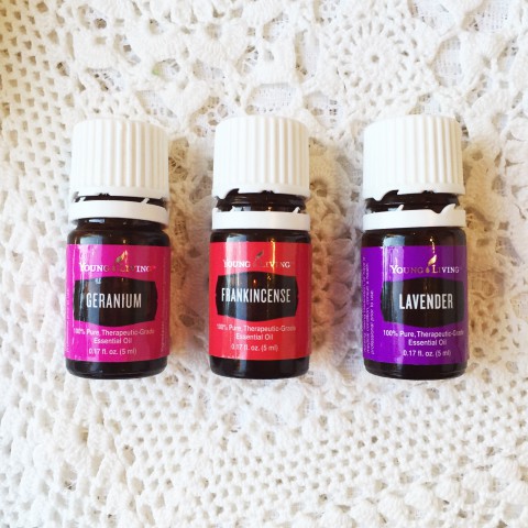8-10 drops of your preferred essential oils (I used 4 drops Geranium, 4 drops Lavender, and 2 drops Frankincense)