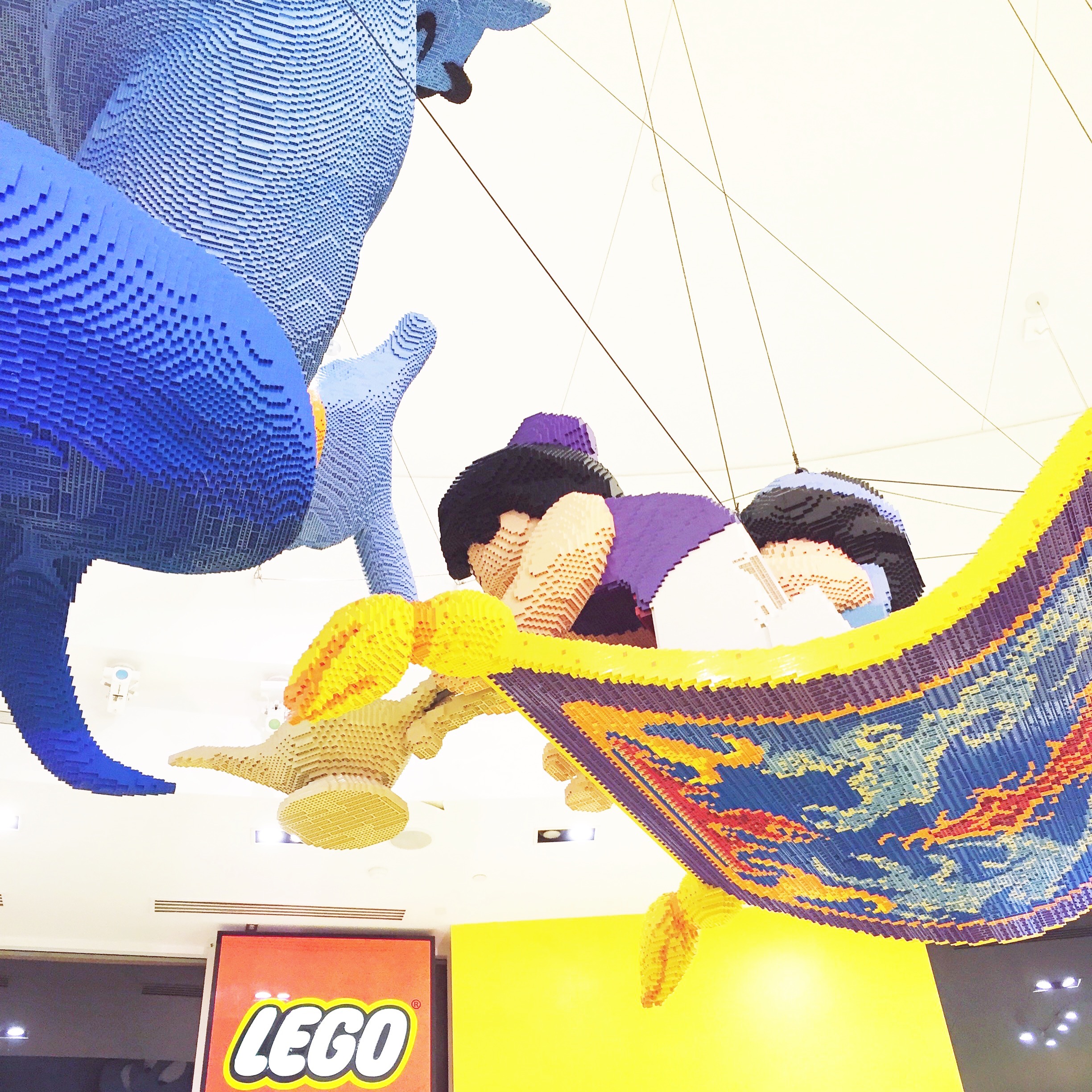 Speaking of breaks, it can also be easy to forget that having fun in the parks, going on rides and eating treats might not always fill your kid’s emotional bucket like going to the Lego Store in Downtown Disney. I knew Sam was going to love it, but overlooked the importance it served for us each day. The Lego Store was right near our hotel, so we passed it 2-4 times a day! There are Lego activity tables setup inside & out where kids can just PLAY. Yep, just play. Create. Have some hands on fun. It seemed really important to Sam each day to have that time and I think it helped soothe the over stimulation too. And yes, that is a huge Aladdin sculpture made from Lego hanging from the ceiling of their store.
