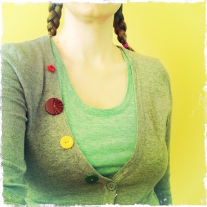 I have a pile of vintage buttons that were my grandmothers and I picked out my favs to stitch onto the front. Just can’t decide whether or not to add more. I kinda like the simplicity of this look, plus I already added some further embellishment on the elbows (which I’ll share with you tomorrow). For now, I’m calling it done. This is definitely my “button collector” sweater.
